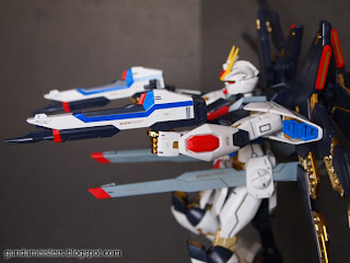 It's armament include a Beam Shield, 2 Beam Sabers, 2 Beam Rifles, 2 Rail Cannons and 8 Dragoons. The Beam Shield is detailed in clear blue and can be attached either on the left or right arm. Located on the hips are the Rail Cannons. It's connected by a ball joint and flips out during firing position. Together with the Rail Cannons is where the Beam Saber handles are being stored. The Beam Sabers are slightly bent which is kind of cool because it gives off a slashing effect. You could connect these two Beam Sabers to form a Double-bladed Beam Saber. But that's not the only armament you could combine. The 2 Beam Rifles can also connect together to form the Beam Cannon. On the wings, of course are the 8 Dragoons. They can easily slide in and out from each segment.